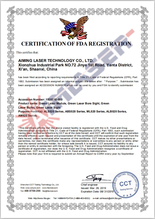 精耀光电(AimLaser)生产的绿光激光器通过了美国FDA认证。