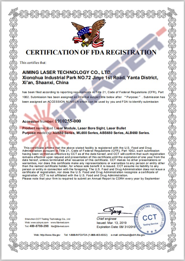 精耀光电(AimLaser)生产的红光激光器通过了美国FDA认证。